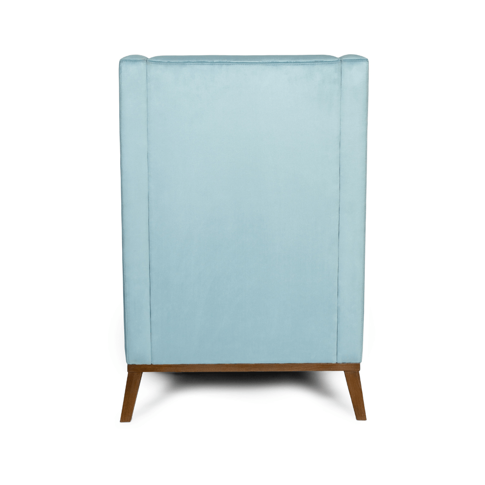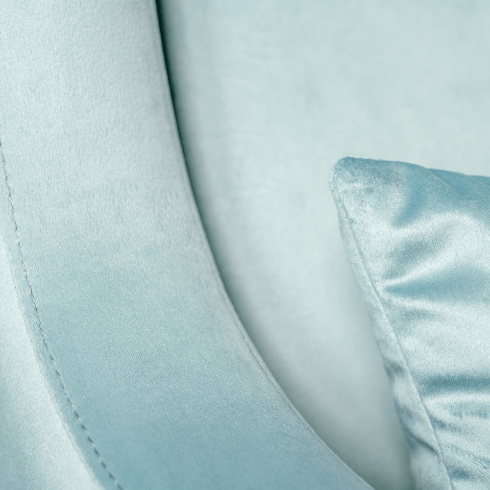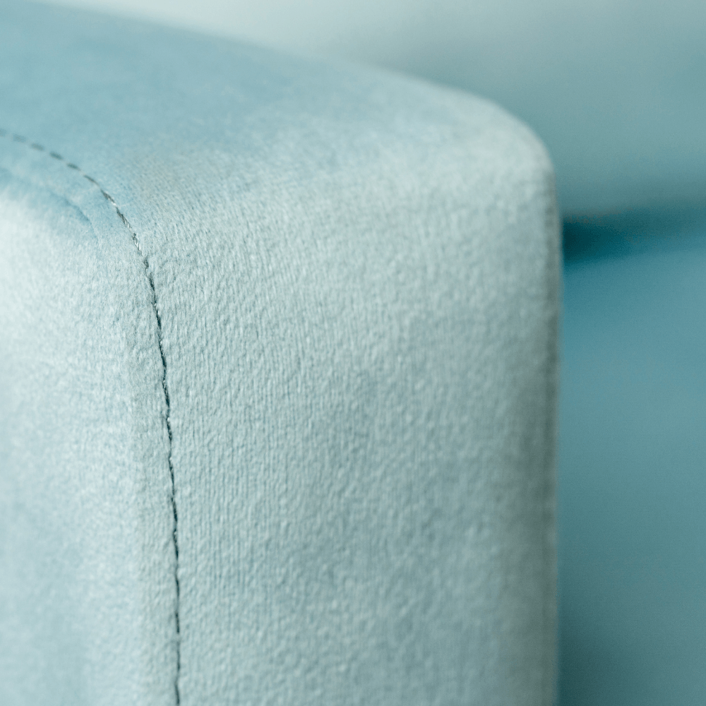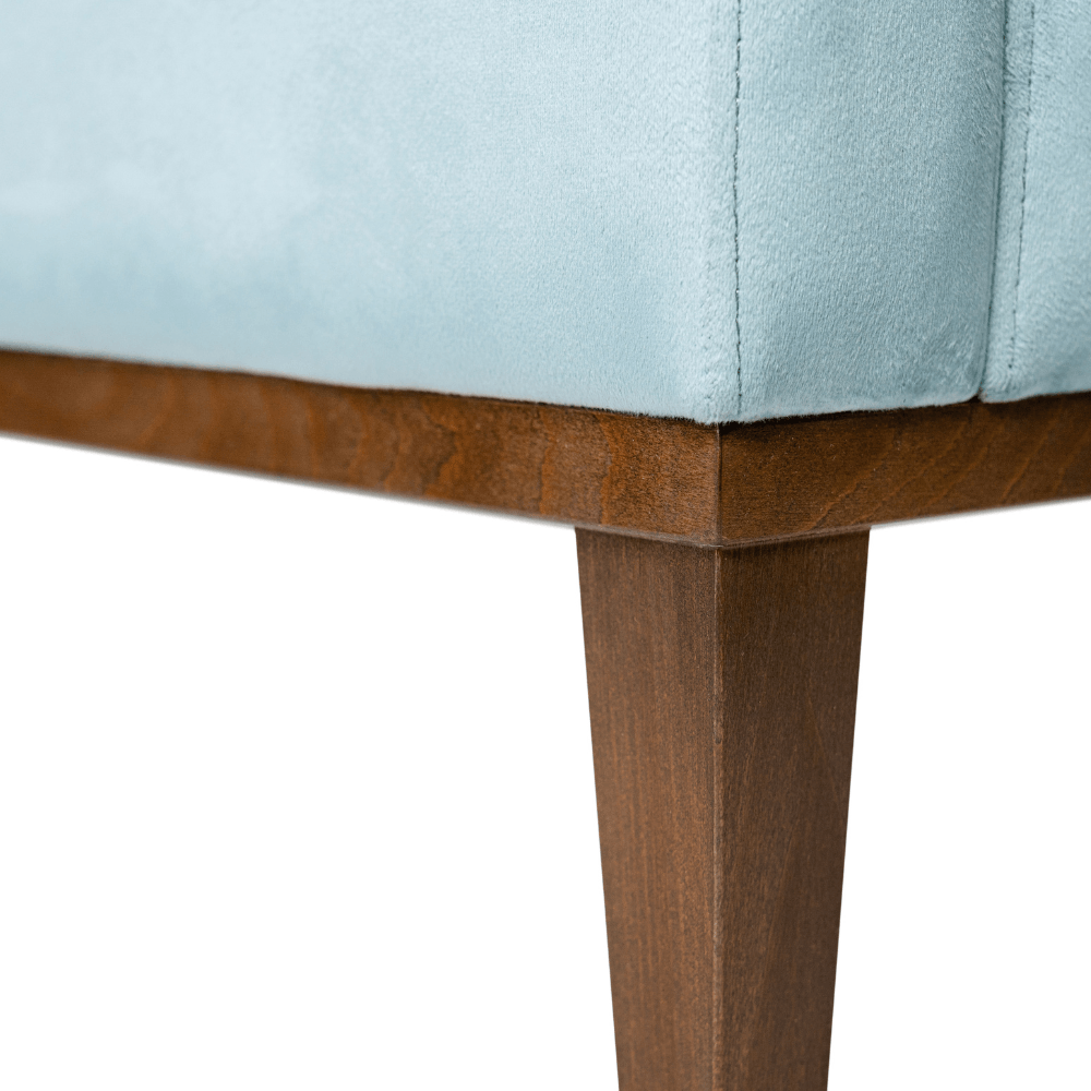 Całość osadzona została na drewnianych nogach, które nadają lekkości, a jednocześnie stabilizują konstrukcję. Ich klasyczne wybarwienie pięknie współgra z aksamitną tkaniną tapicerską, dostępną w szerokiej palecie kolorystycznej – od subtelnych pasteli po nasycone odcienie.