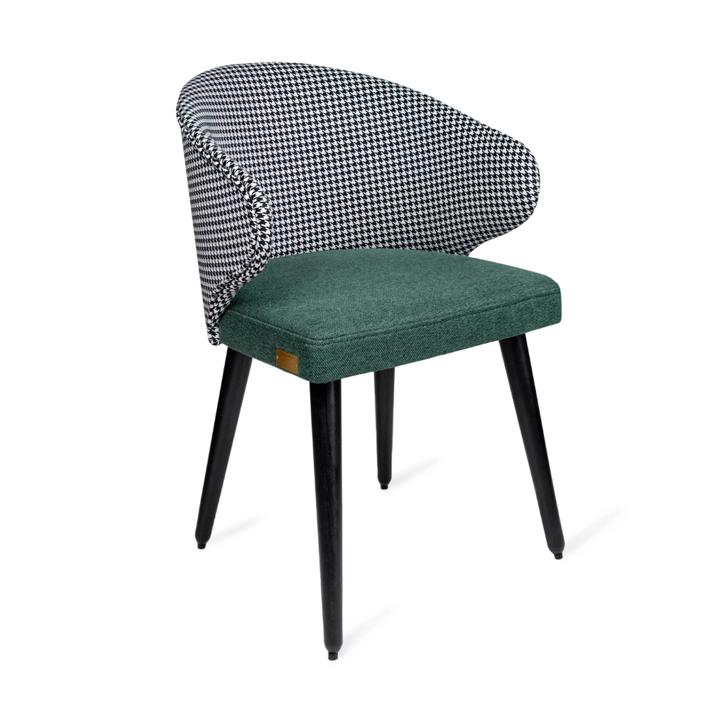 Krzesło MERKAB wyróżnia się nietuzinkowym designem. Oparcie wykończone w klasyczną pepitkę nadaje mu elegancji i przyciąga wzrok, podczas gdy tapicerowane siedzisko w butelkowozielonym odcieniu zapewnia nowoczesny akcent i idealnie współgra z drewnianymi nogami. To mebel, który sam w sobie stanowi dekorację wnętrza.