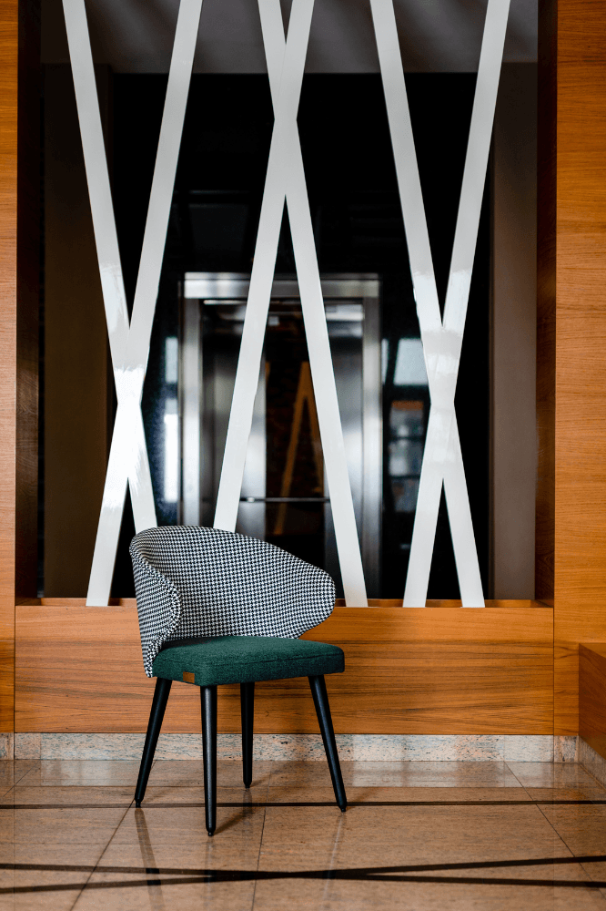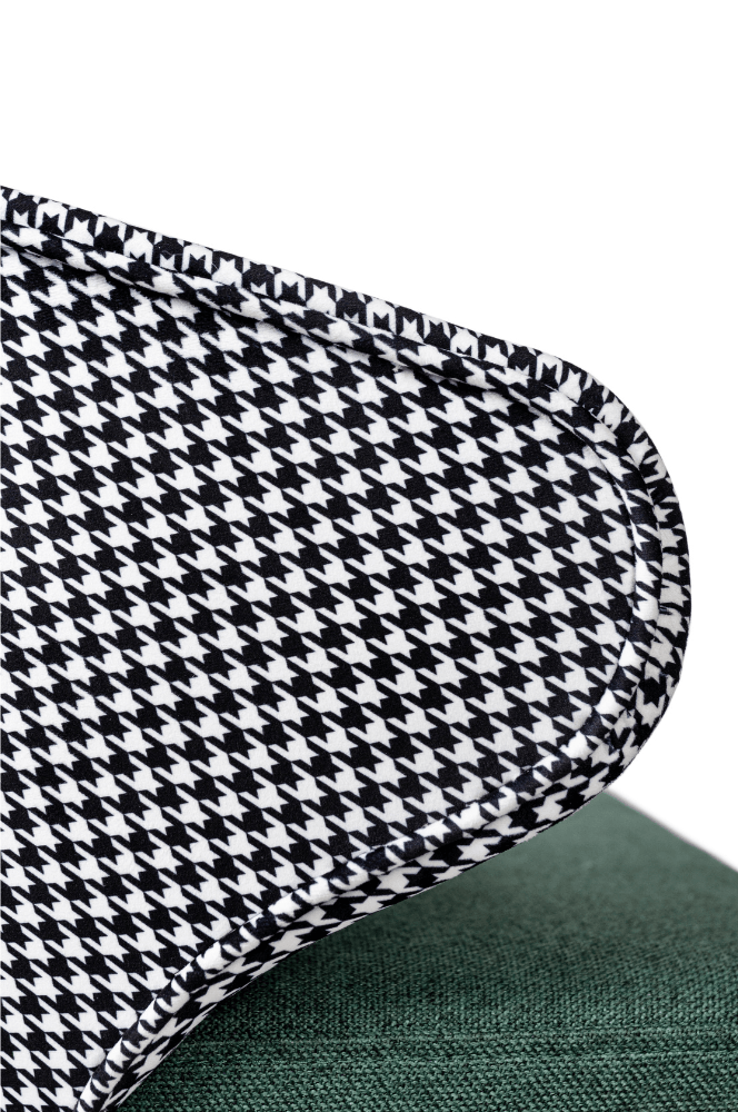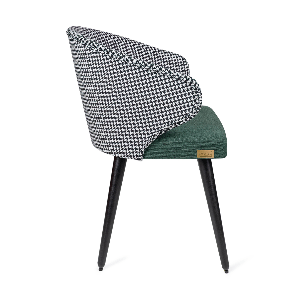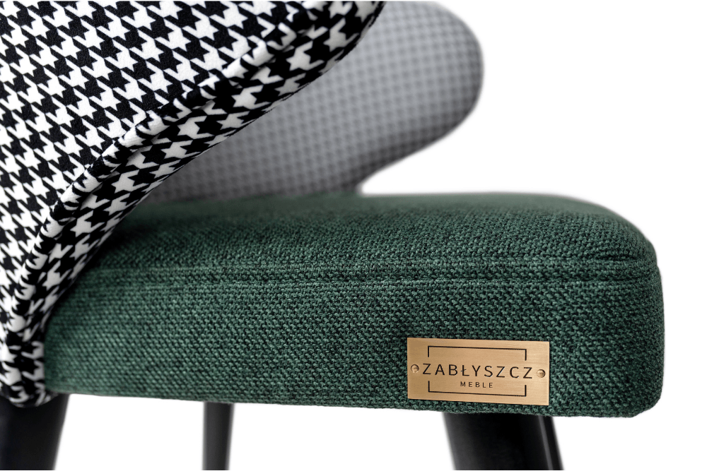 Zestawienie klasycznej pepitki na oparciu z gładkim, zielonym siedziskiem tworzy wyjątkową kompozycję wizualną, która nada wnętrzu niepowtarzalny charakter. Styl retro w nowoczesnym wydaniu? Właśnie tak prezentuje się MERKAB – odważny, ale ponadczasowy.