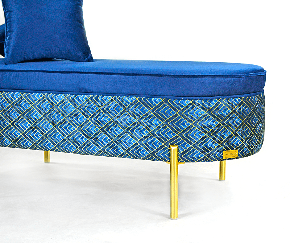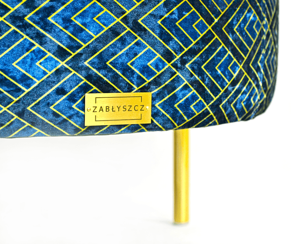 DENEB to pufa, której nie sposób przeoczyć. Głębia szlachetnego niebieskiego weluru, złote, smukłe nogi i dekoracyjny wzór tkaniny bocznej tworzą harmonijną kompozycję, która wprowadza do wnętrza nutę glamour i artystycznego wyrafinowania.