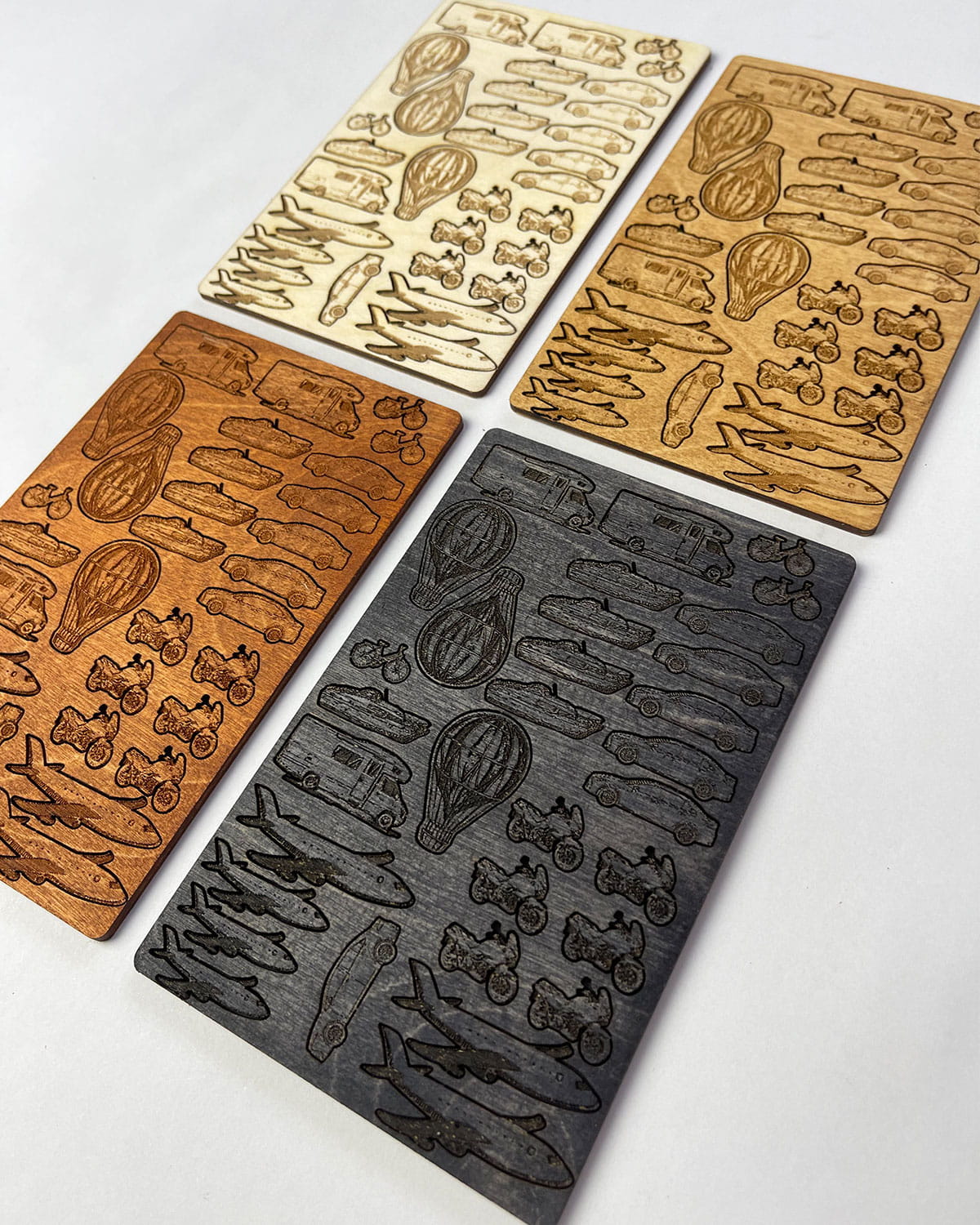 Wszystkie pojazdy zostały wygrawerowane i wycięte laserowo z dbałością o najmniejszy detal. Umieszczono je na formatce o wymiarach 90x140 mm, dzięki czemu są łatwe w przechowywaniu i aplikacji.